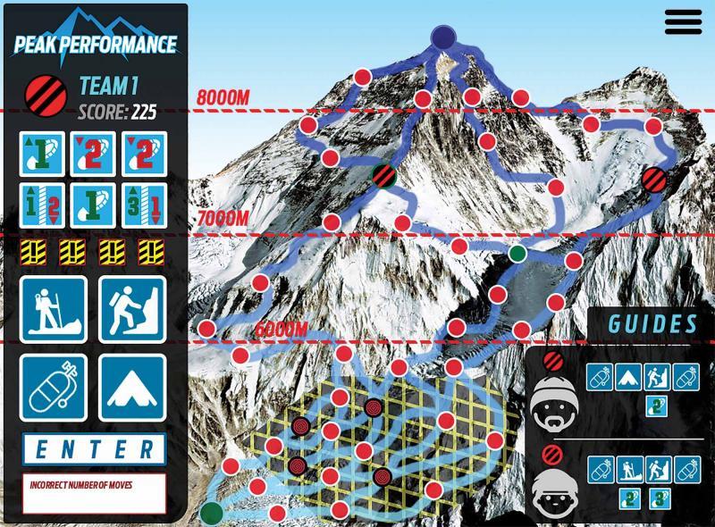 During a 20 day expedition, teams aim to guide their clients up to the top of Mount Everest and then safely back to base camp. They must consider a range of factors including client fitness levels, weather, best route to the summit, acclimatisation, use of oxygen, pitching tents and strategies to outwit other teams in order to win. Key information is delivered to their teams tablet each day of the expedition. Teams race against the other teams to make swift yet intelligent and sober decisions. As space is limited in each height zone, teams who procrastinate will be locked into a less ideal path or be unable to move!